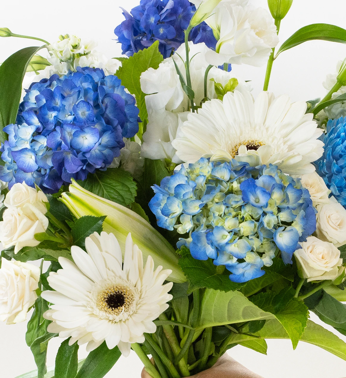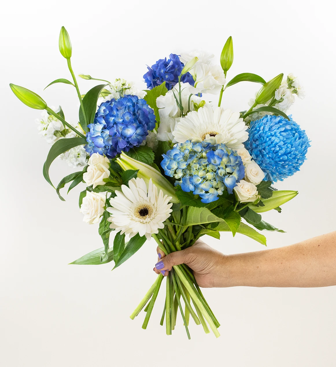 A stylish bouquet of classic whites and greens with cool blue highlights.