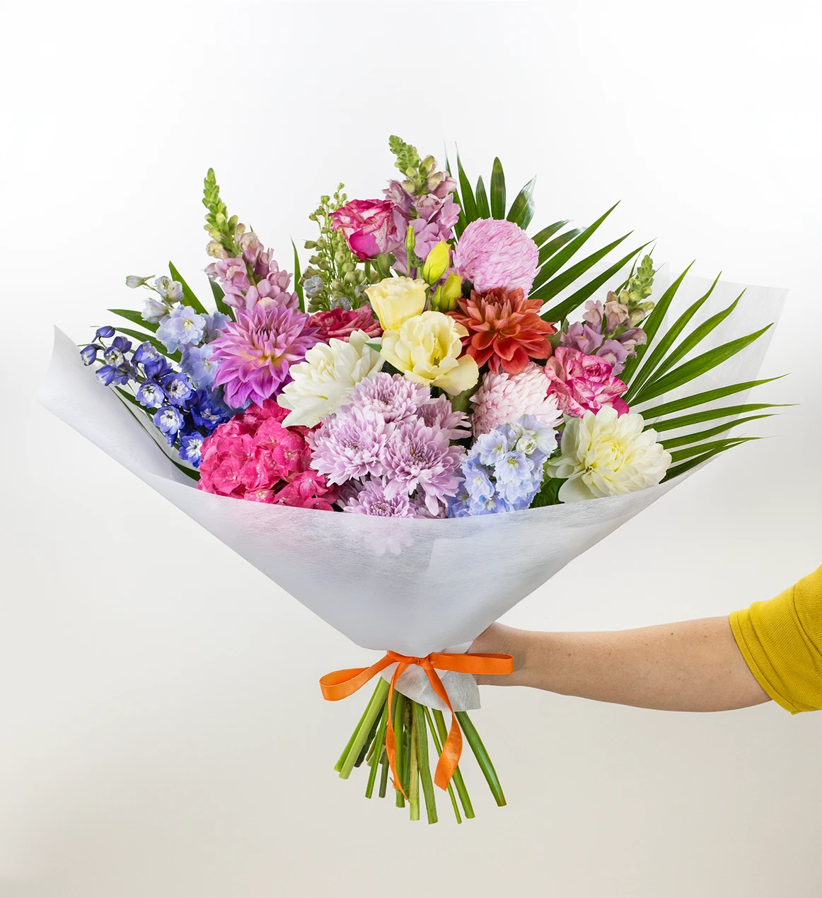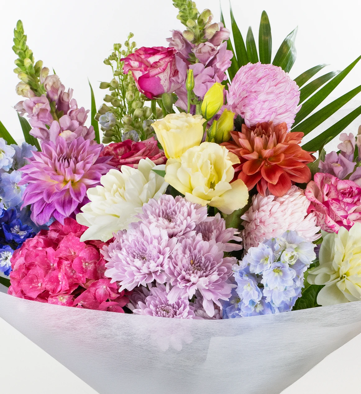 A fresh, uplifting mix of seasonal blooms in soft pastels and gentle brights – effortlessly lovely for any occasion.